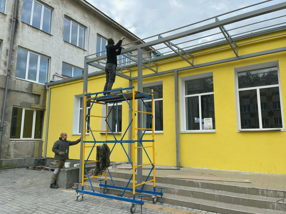 В даний час тривають роботи з утеплення фасадів, відновлення вимощення, встановлення навісів над входами та монтажу системи водовідведення.